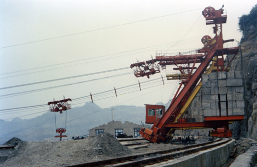 纜索型起重機如(3-5所示。構造特點是取物裝置的起重小車沿著架空的承載鋼絲繩索運行。承載索的兩端分別固定在主、副塔架的頂部,塔架固定在地面的基礎上。小車在鋼絲繩索上運行,起升卷筒和運行卷筒安裝在主塔架上,另一側副塔架上裝有調整鋼絲繩索張力的液壓拉伸機。應用在跨度特別大,地勢復雜、起伏不平或各種類型起重機難以駛達的工作場地。如林場、煤廠、江河、山區和水庫等。纜索型起重機一般是為已確定的工地專門制作的,它的結構和工作性能起決定于它所服務工地的輪廓尺寸和工作性質。