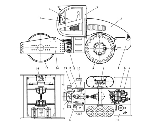1-電氣系統;2-操作系統;3-駕駛室;4-覆蓋件;5-液壓系統;6-發動機總成;7-后車架;8-后橋;9-后輪;10-變速器;11-中心鉸接架;12-轉向油缸;13-行走馬達;14-前車架;15-振動輪總成;16-行走馬達;17-液壓油箱;18-柴油箱