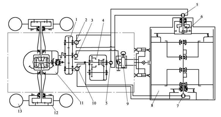 1-分動箱;2-行走驅動軸向柱塞泵;3-轉向及風扇用雙聯齒輪泵;4-變速箱;5-行走驅動定量馬達;6-行星減速器;7-振動驅動定量馬達;8-振動輪;9-液壓轉向器;10-振動驅動變量泵;11-驅動橋;12-輪邊行星減速器;13-輪胎