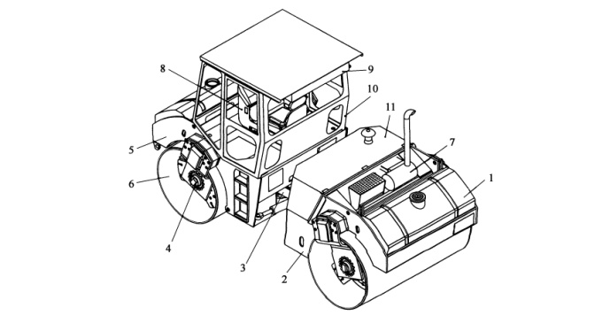 1-灑水系統;2-后車架;3-中心鉸接架;4-液壓系統;5-前車架;6-振動輪;7-動力裝置;8-操縱臺總成;9-空調;10-駕駛室; 11-覆蓋件
