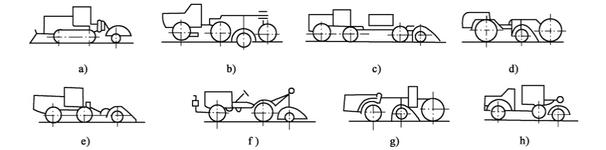 a)履帶式 ;b)輪胎式 ;c)輪履結(jié)合式 ;d)自行式 ;e)半拖式 ;f)懸掛式 ;g)中置式 ;h)后置式