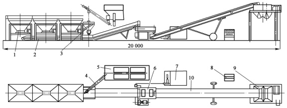 1-配料機(jī) ;2-集料機(jī) ;3-粉料配料機(jī) ;4-螺旋輸送機(jī) ;5-臥式存?zhèn)} ;6-攪拌機(jī) ;7-供水系統(tǒng) ;8-電氣控制柜 ;9-混合料儲倉 ;10上料皮帶機(jī)