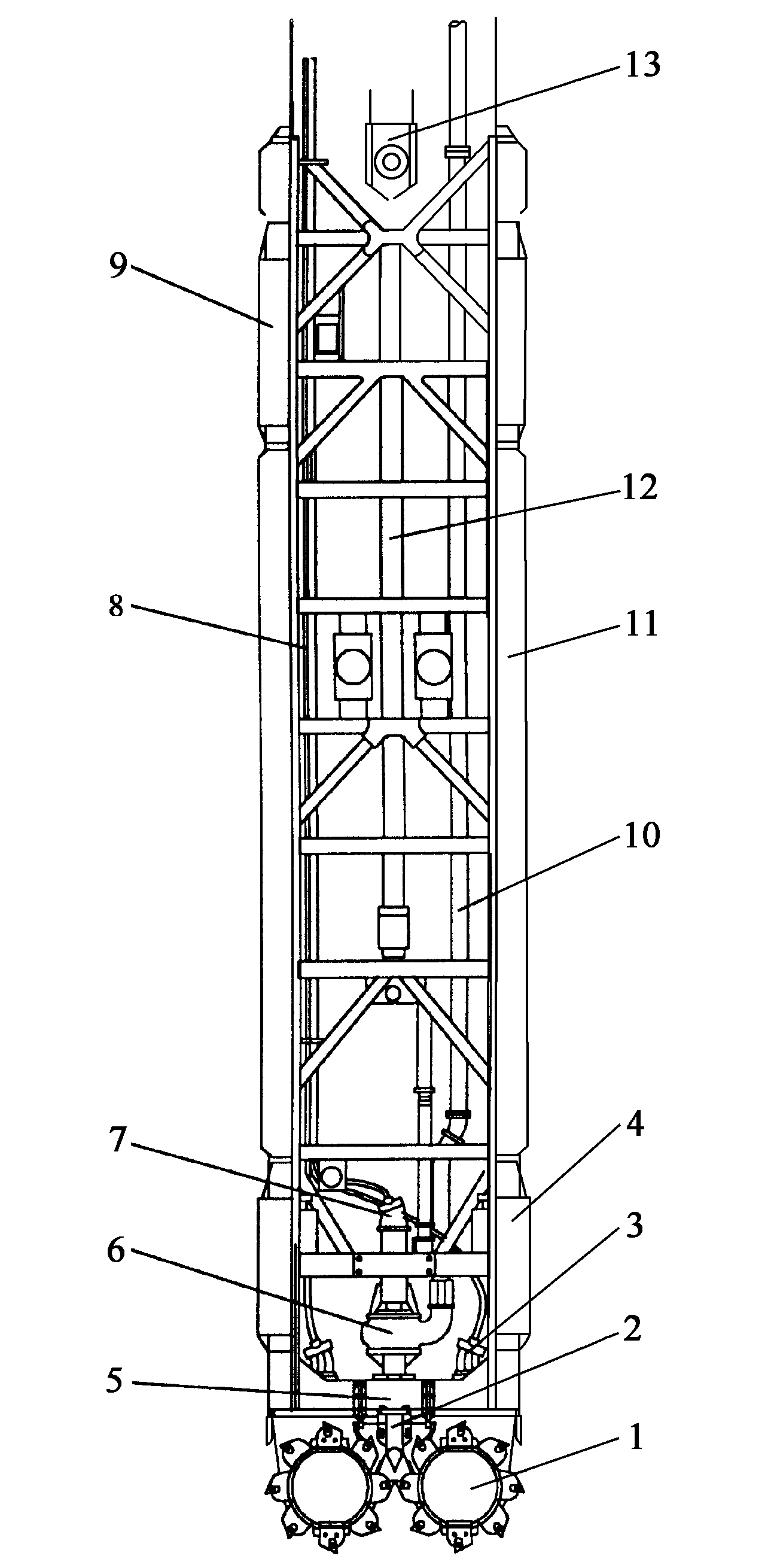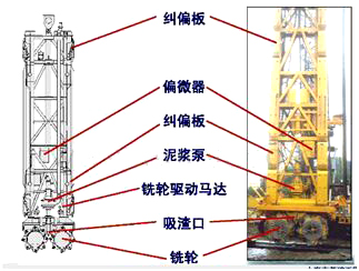 1切削滾輪;2泥漿抽吸頭;3滾切輪馬達;4下導向板;5變速器;6泥漿吸料泵;7泥漿泵馬達;