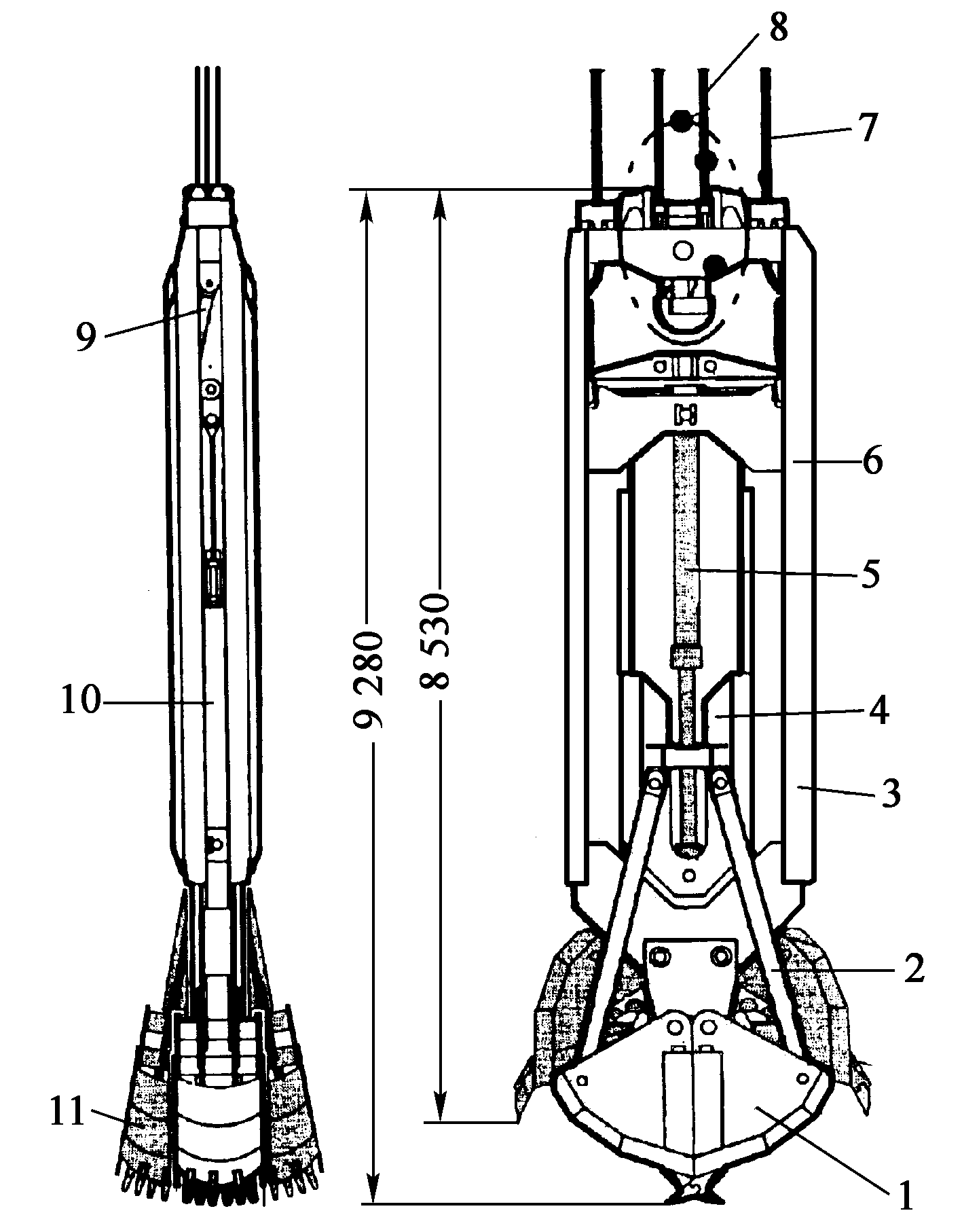 圖2-45為LiebherrHS843型液壓抓斗。主要由抓斗1、抓斗油缸5、抓斗導向裝置3、抓斗糾偏油缸9、垂直傳感器10和抓斗機架6等組成。