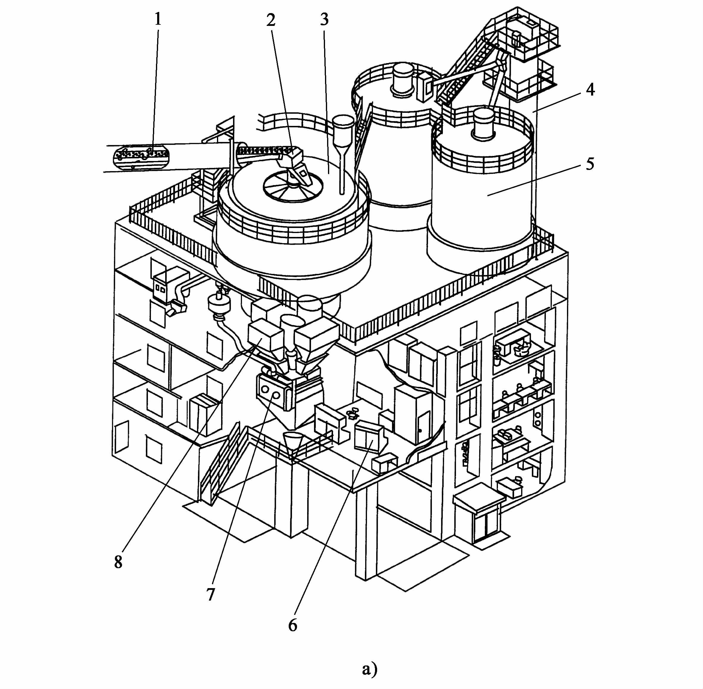 1提升皮帶運輸機;2回轉分料器;3集料塔倉;4斗式垂直提升機;5水泥筒倉;6控制系統;7攪拌系統;8集料稱量斗
