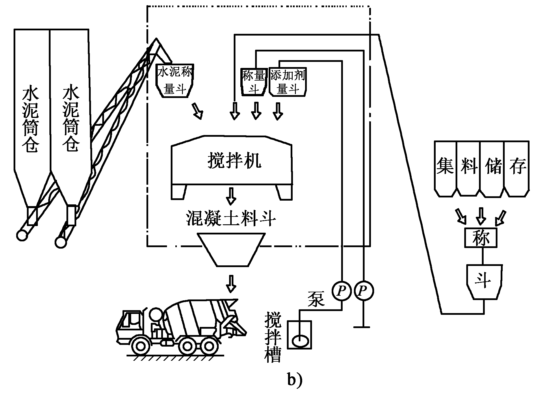 a.混凝土攪拌站結構圖;b.工藝流程圖