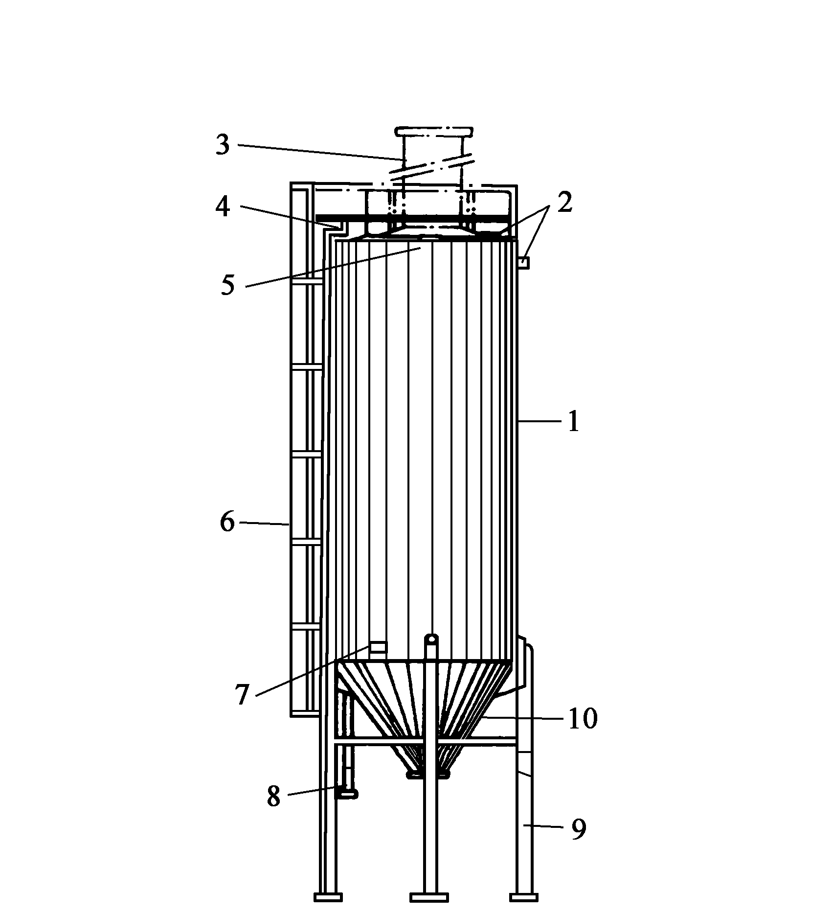 6.爬梯;7.下部料位指示器;8.進料管;9.支架;10.下圓錐