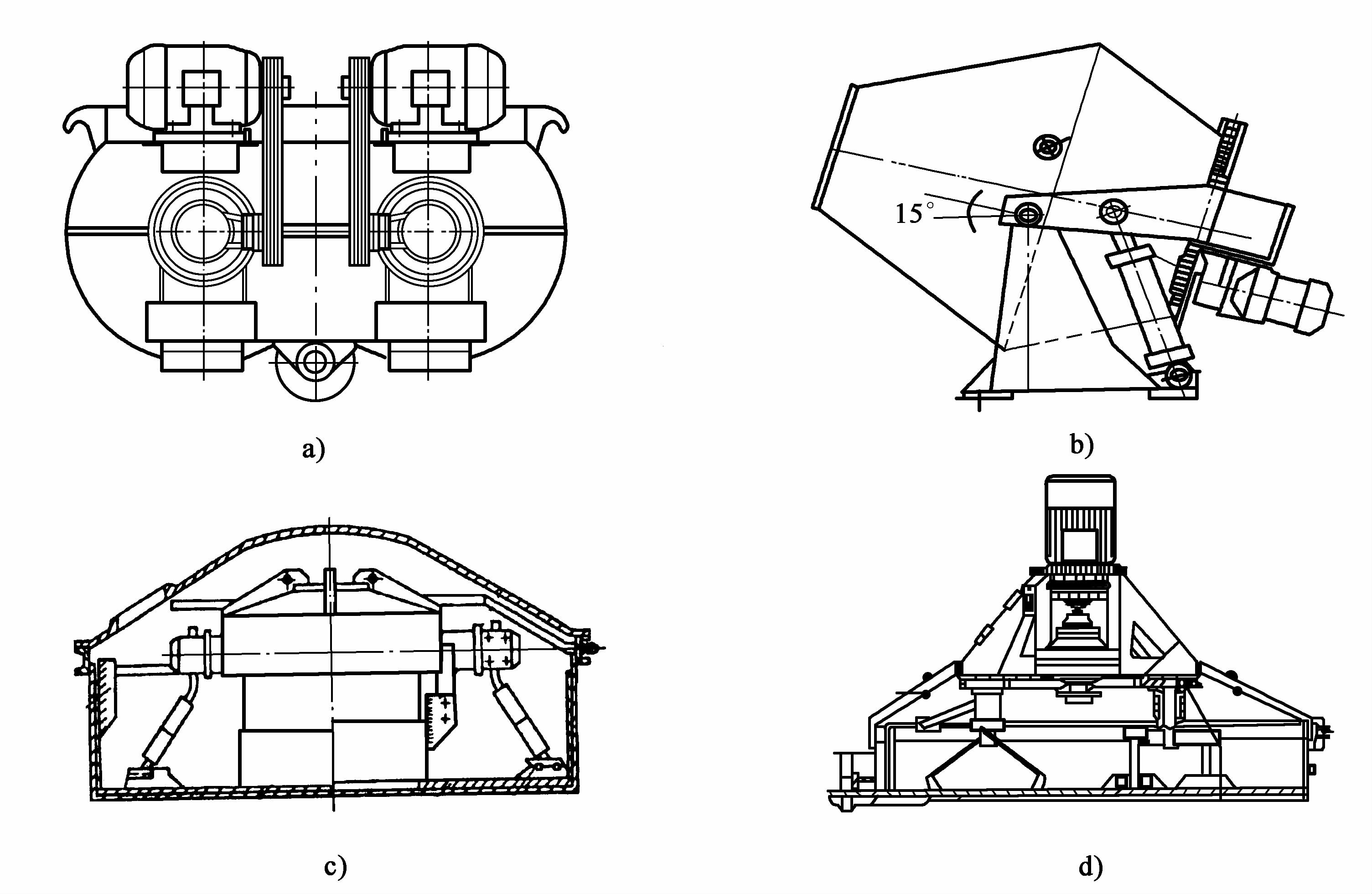 a)雙臥軸強制式攪拌機;b)錐形傾翻出料攪拌機;c)立軸強制式攪拌機;d)行星強制式攪拌機