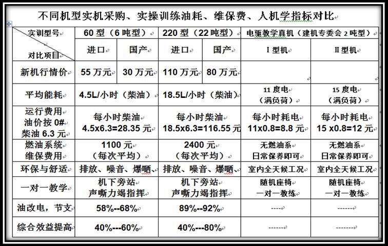 5、中國建設教育協會建設機械職業教育專業委員會擁有自主知識產權的電動挖機新型教具與傳統的燃油挖機培訓模式比較,如下:
