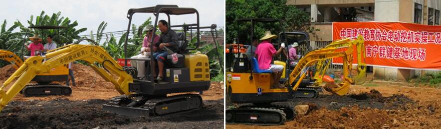 中國建設教育協會建設機械職業教育專業委員會聯合科研院所和高等院校、會員廠商,聯合研發了一種無排放、成本低、高效節能的教學專用電動挖掘機,實現“油替電”,消除了尾氣排放和高噪音污染,顯著降低了實操燃油消耗等高成本;同時可以實現將電動教學挖掘機方便地由“室外露天訓練”轉移到“室內場地全天候訓練”,保障了學員全天隨時上機的實操機時供應,顯著化解了學員技能水平提升與設備機時緊張之間的矛盾;同時設備采用“電力驅動”和“燃油發動機”兩種動力模式,提高了設備轉場和投放邊遠地區服務的能力,摸索出“進村培訓、設備下鄉培訓、農民工自家門口培訓、連隊駐地培訓、退伍兵就地培訓”等新的職業培訓服務模式。